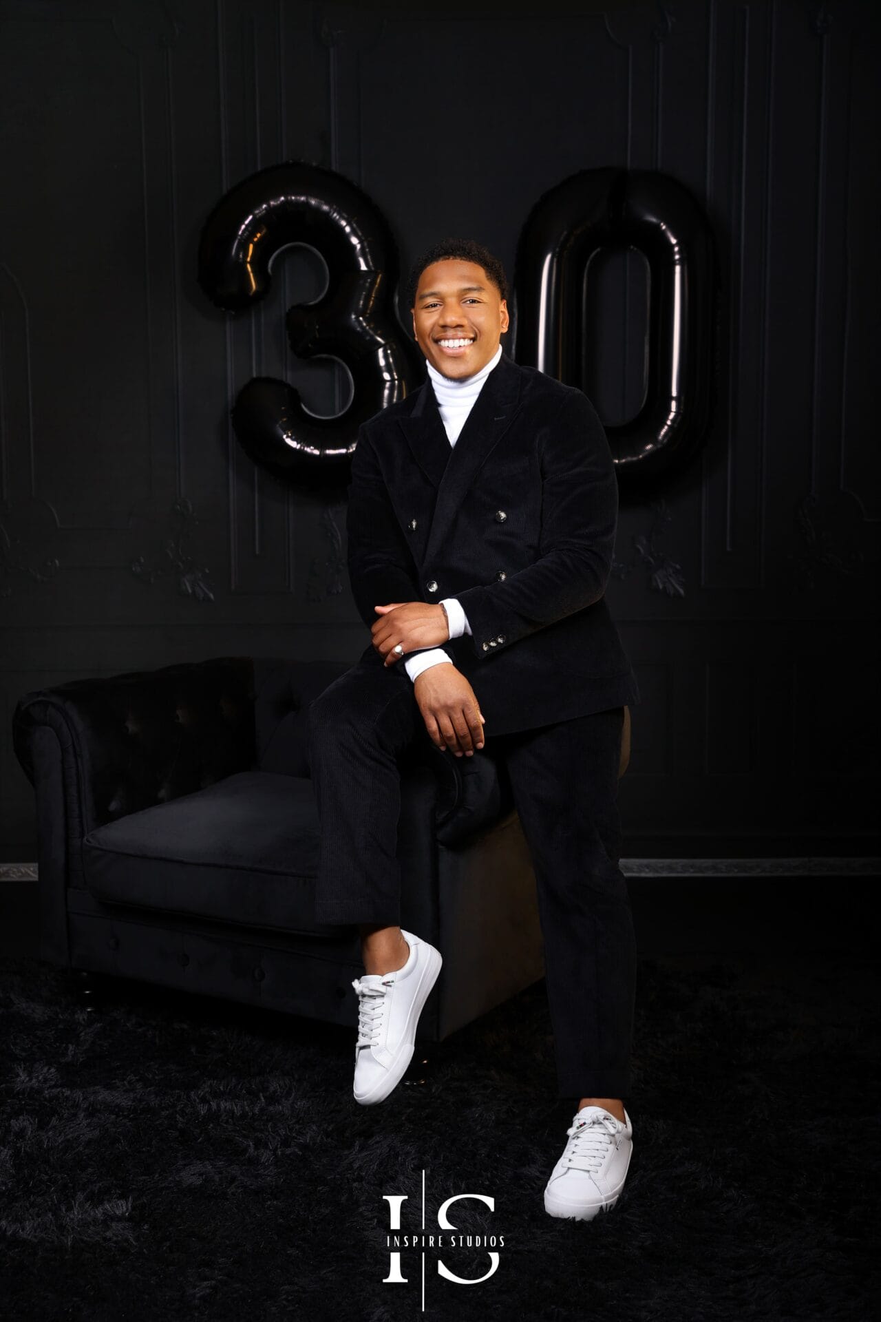 luxury mens birthday photoshoot with number balloons and modern outfit portrait